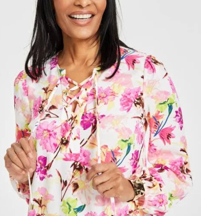 INC International Concepts Women's Printed Lace-Up Blouse Tori Garden Size XL